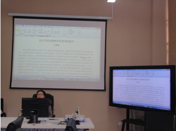 研讨会由“教师发展研究小组”组长施惠平副教授主持。研讨会首先是论文交流环节,王伟炜老师介绍了她的论文《论大学英语教师评价素养的提升》并恳切希望在座的老师给她提出修改意见,严敏芬教授、张洁帆老师和秦朝霞老师等都对论文的修改方向提出了宝贵的意见和建议。接着,英语专业研二学生王姣介绍了她关于教师“反思性教学”的研究,随后施惠平老师就此研究内容和方法进行了解释和评论;随后,英语专业研一学生张艳秋汇报了她和张小华同学去上海参加的Gary Barkhuizen教授的讲座“Narrative Inquiry of Professional Development”,严敏芬教授也就此研究课题进行了相关介绍。随后,在座的师生还就这些研究课题进行了讨论。