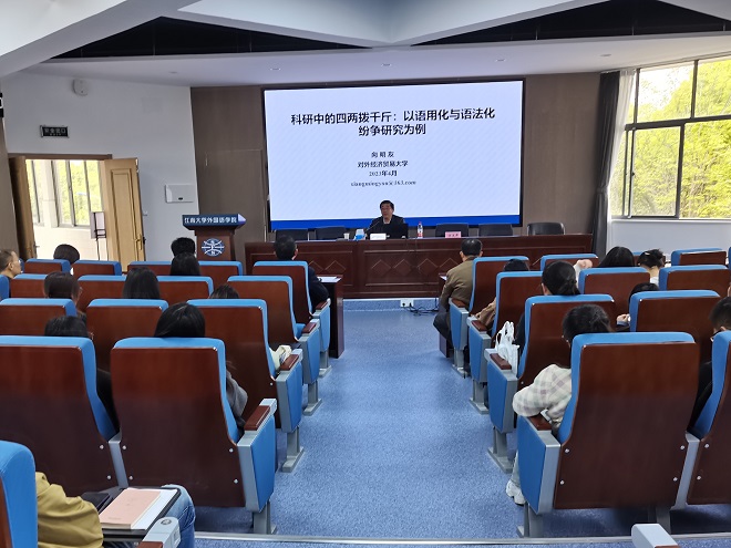 语用化概念自问世与语法化的争端就一直不绝于耳,为阐明语用化概念与语法化的本质区别,明晰二者在语言演化过程中互补交融的状态,交流语言学研究经验和方法,提升外院学术和科研水平,伟德国际1946于2023年4月14日特别邀请对外经济贸易大学英语学院院长向明友教授为我院师生作学术演讲。伟德国际1946院长方文开教授出席并主持本次会议,学院师生共同聆听讲座。