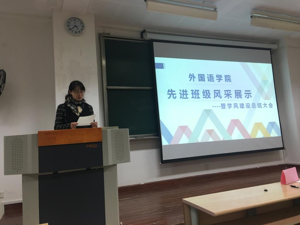 最后由赵莹老师宣读本次班级风采展示的评选结果。19个参选班级中的8个班级获得了先进班级荣誉,它们分别为日语1403,英语1403,英语1506,英语1502,英语1601,英语1603,英语1606以及日语1601。