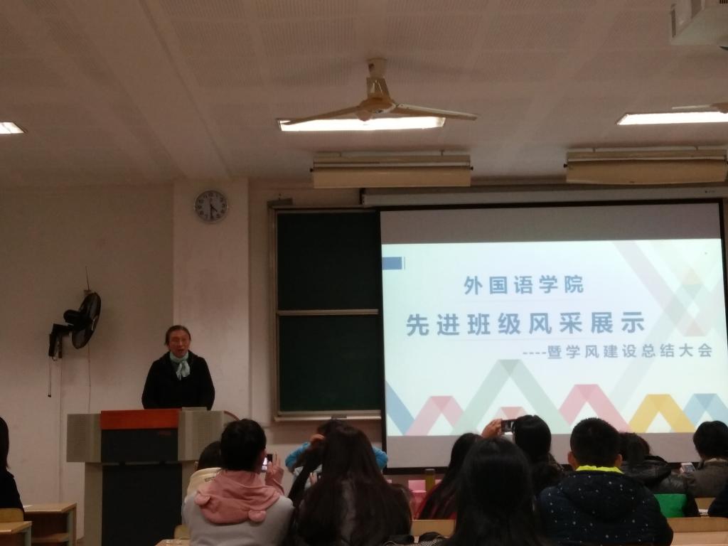 为了推动学风建设,塑造优良班风,建立学风建设长效机制,伟德国际1946于2016年11月9日举行了 2016年度外国语先进班级风采展示大会。院党委副书记赵莹、调研员张晓虹老师、 辅导员王琰玲、刘琦老师等学院老师及全院主要学生干部参加了此次大会。