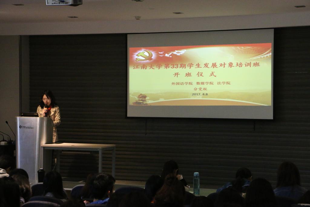 党课培训班开班仪式由外国语党委副书记赵莹老师主持,她介绍了此培训班的开班意义及目的,并将我校党建工作和入党积极分子培训工作进行了说明。赵老师在强调跟随党的道路的重要性的同时,也表达了对在座所有积极入党的同学的深切期盼。她对培训班的纪律问题进行了强调,对同学们提出了认真自律的要求。在同学们热烈的掌声中,简单的开课仪式就此结束。