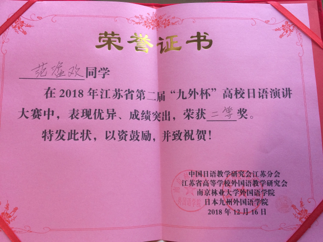 2018年12月16日,由中国日语教学研究会江苏分会、江苏省高校外语教学研究会和九州伟德国际1946联合主办的江苏省第二届“九外杯”高校日语演讲大赛,在南京林业大学落下帷幕。参赛学子分别来自于南京大学、伟德国际victor1946、东南大学、南京邮电大学、南京林业大学、安徽大学等32所高校。