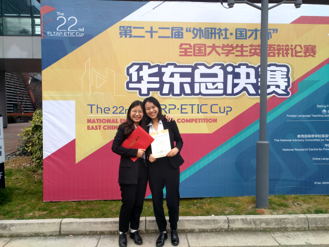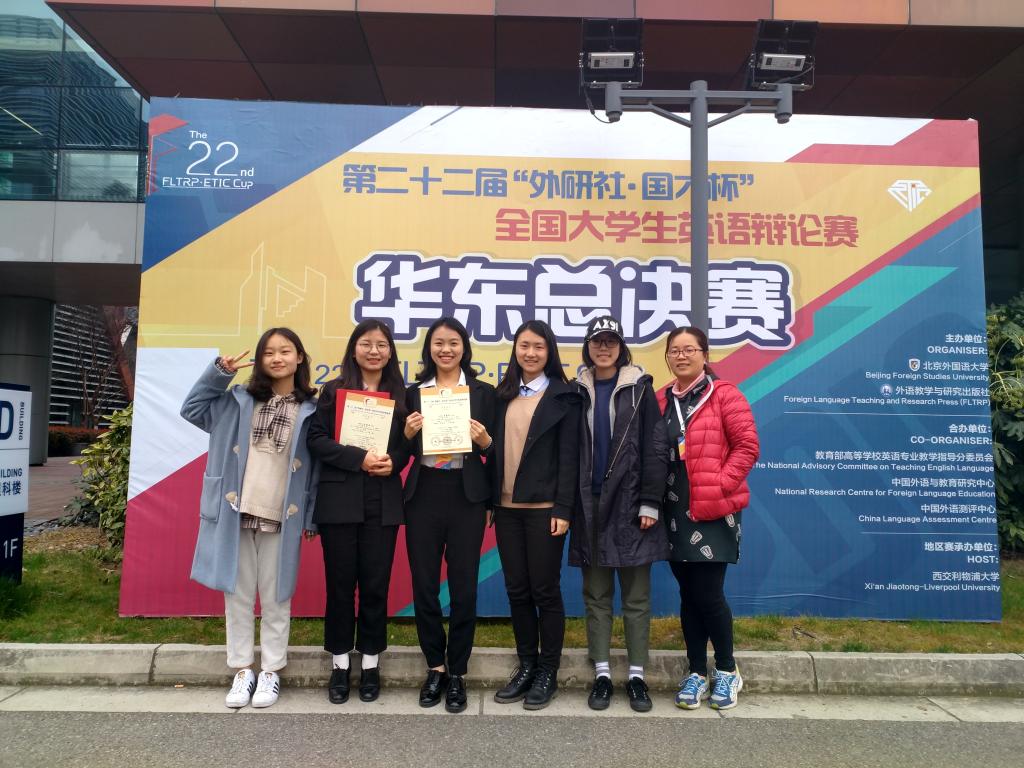 2019年3月22日至24日,第二十二届“外研社·国才杯”全国大学生英语辩论赛华东赛区总决赛在苏州西交利物浦大学举行。来自江苏、安徽、上海、浙江、山东5省市的110支高校代表团参加了本次比赛,争夺28个全国总决赛晋级名额。最终来自上海外国语大学、国防科技大学国际关系学院和复旦大学的队伍分别获得地区赛的冠军、亚军和季军。我院英语专业1605班学生田怡凡和戚淼代表我校参加比赛,最终排名第16,成功晋级全国赛。