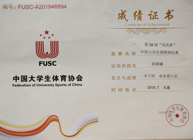 2019年8月,第28届“应氏杯”全国大学生围棋锦标赛在大连理工大学举行,伟德国际1946英语1802班陈颖璐同学代表伟德国际victor1946参加了本次比赛,并在比赛中取得了女子组第六名的好成绩。
