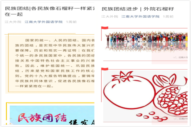 活动开始前,通过学院的微信公众号、官网等网络平台进行广泛宣传,抓好创建氛围营造。开展民族团结进步宣传月活动是做好民族工作、营造各民族 良好氛围、促进民族和谐的重要举措。利用网路平台强化对民族特色文化介绍、学习,提倡各民族文化相互欣赏、相互学习,共同发展。线下、线上相结合,不遗余力的宣传民族团结进步宣传月活动,在全院氛围内营造民族团结进步的良好氛围。