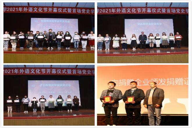 学院分团委书记陆芳老师宣读了学院2020年获得各项荣誉的学生名单。在社会奖助学金颁奖环节,陆伟栋先生、钱志钢先生、崔明姬老师分别为获奖学生进行颁奖。学院党委副书记刘伯贤为社会奖助学金捐赠企业颁发捐赠证书。受助学生代表朱城城同学发言,表达了对学院和社会爱心人士关心帮助的感谢。随后伟德国际1946英语、日语系主任公布本年度外国语文化节相关赛事,鼓励同学们踊跃参赛,在竞赛中提升专业能力。