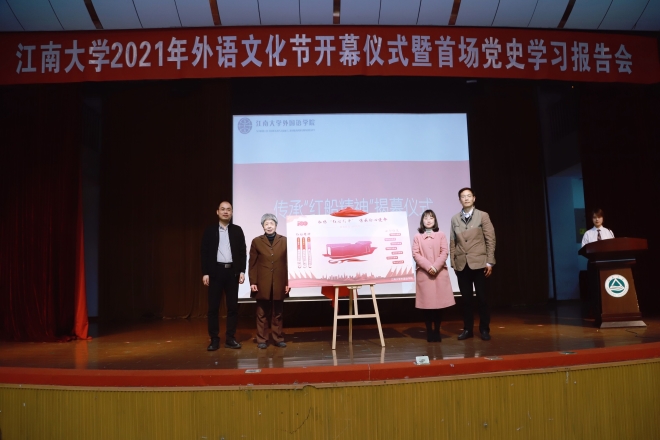 4月7日下午,伟德国际victor19462021年外语文化节开幕仪式暨首场党史学习报告会在南区大学生活动中心如期举行。伟德国际1946党委书记史志洪、校学生工作部(处)副处长俞立峰、校团委副书记单云婷、学院党委副书记刘伯贤、学院副院长顾琦一、“爱菲斯奖助学金”捐赠代表陆伟栋、“安达助学金”捐赠代表陈志钢、学院英语系主任孙志祥、日语系主任崔明姬、学院关工委常务副主任鲍国庆、学院分团委书记陆芳、相关学院学生代表以及我院500余名学生出席了本次活动。