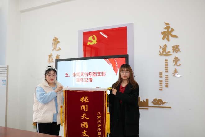 接着,举行了张闻天特称团支部交接仪式。上一届“张闻天特称团支部” 英语1805团支书石超琴同学通过对过去两年团支部丰富活动及团员青年优异成绩的图文展示,展现了英语1805团支部在张闻天精神的影响下,“聚是一团火,散是满天星”的青春风采。新一届“张闻天特称团支部”英语1904团支书孟晓钰同学从石超琴同学手中接过张闻天团支部的锦旗,表示将认真学习张闻天精神,坚定孜孜不倦,奋发向上的信心和决心,把特称团支部的优良传统发扬光大。