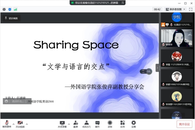 “Sharing Space分享空间”是伟德国际1946学生会在新文科、新外语背景下,旨在为广大外院学子搭建学术、技能等信息分享交流平台。3月26日14时,“Sharing Space分享空间”邀请伟德国际1946张俊萍副教授线上参与主讲“文学与语言学的交点”主题圆桌会,会议吸引近百名同学参与线上交流。
