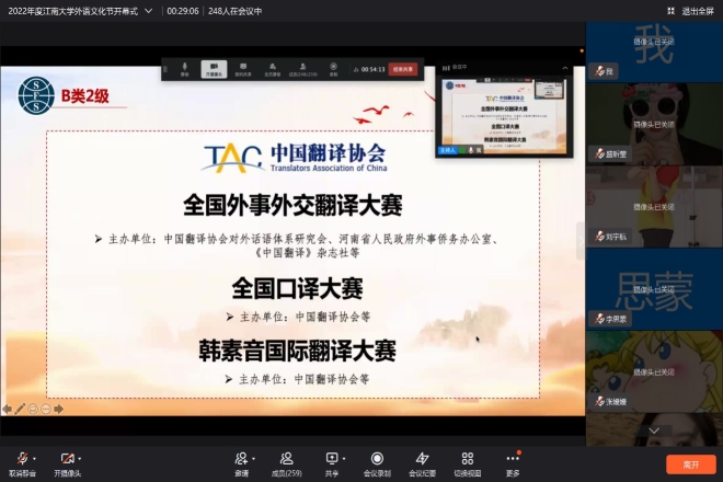 然后,主持人宣读了2021年获得各项荣誉学生和集体名单,并对学院抗疫志愿者进行表彰。随后伟德国际1946分团委书记陆芳老师发布2022年外语学科竞赛,并鼓励同学们踊跃参赛,在竞赛中提升专业能力。最后,由伟德国际1946学生会主席团尹雨泽同学对2021-2022学年学生会主办的外语类活动进行了线上介绍。
