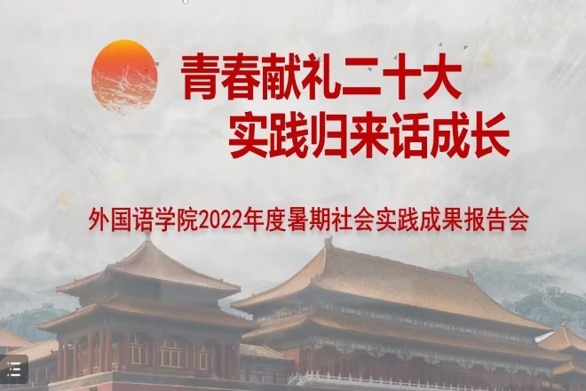 青春献礼二十大,实践归来话成长。本次实践报告会展现了我院学子暑期社会实践的累累硕果,彰显了外院学子的社会责任感与使命感。下一步,我院将及时总结经验、创新形式载体、广泛发动宣传,引导广大学子在社会课堂中受教育、长才干、做贡献,以实际行动迎接党的二十大胜利召开。