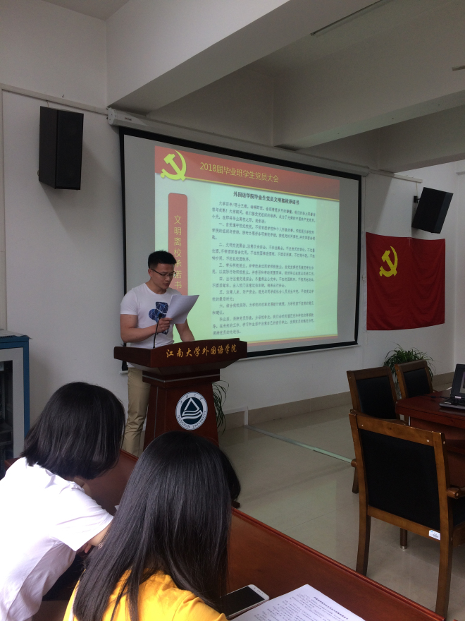 会上,黄书记以“感恩母校、奉献社会”为主题致词,并对毕业班党员在铭记党员义务、增强党员意识、文明离校、奉献社会等方面提出嘱咐。接着党委秘书许广玉具体讲解了毕业生党员组织关系转接的相关工作和要求。在重温入党誓词后,2014级本科党支部书记葛正东同学宣读《伟德国际1946毕业党员文明离校承诺书》,全体毕业生党员在承诺书上庄严签字。