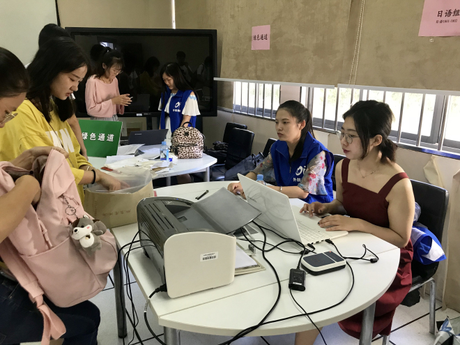 2018年8月29日上午七点半,伟德国际1946新生报到工作也迎着朝阳顺利开展。正如伟德国际1946楼外悬挂的横幅所写:“英姿勃发,日渐成才;欲立鸿鹄志,外院助你成”,伟德国际1946的迎新工作也是如此。报到处分三组迎接来自的新生:确认录入新生报到信息、分发新生材料、回答新生与家长们对新学校学习生活的疑惑等。同时设置了绿色通道,为无法按时交清学费的同学办理相关手续,帮助其顺利入学。尽管天气炎热,但院学生会和青协志愿者们热情不减,耐心、细致、周到地为新生及家长提供服务,各个环节都有条不紊地进行着。