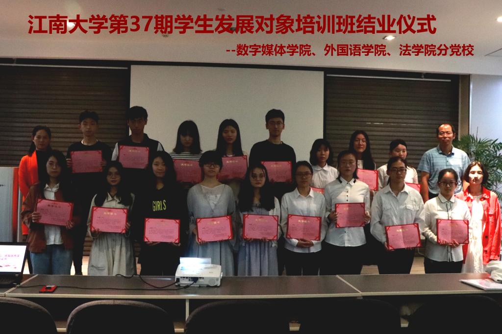 随后进行优秀学员颁奖仪式,我院邹月、于添添、胡自威、罗品辉、马金鑫等五名学员被评为优秀学员,刘伯贤副书记为优秀学员颁发证书并合影留念。结业仪式在数媒学院党委副书记副院长陈祎老师的讲话过后落下帷幕。