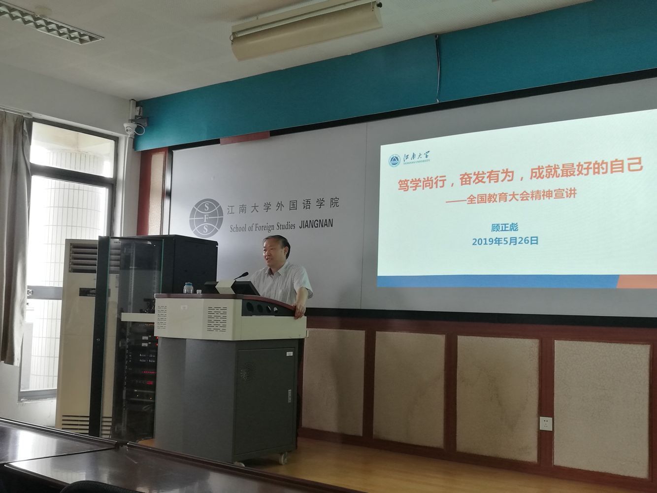 2019年5月26日下午,伟德国际victor1946副校长顾正彪教授走进2C618教室,给伟德国际194617级、18级本科学生150余名同学讲授了一堂主题为“笃学尚行,奋发有为,成就最好的自己——全国教育大会宣讲”的形势与政策课。学院党委副书记刘伯贤、分团委书记杨艳、分团委副书记张圆到场听课。