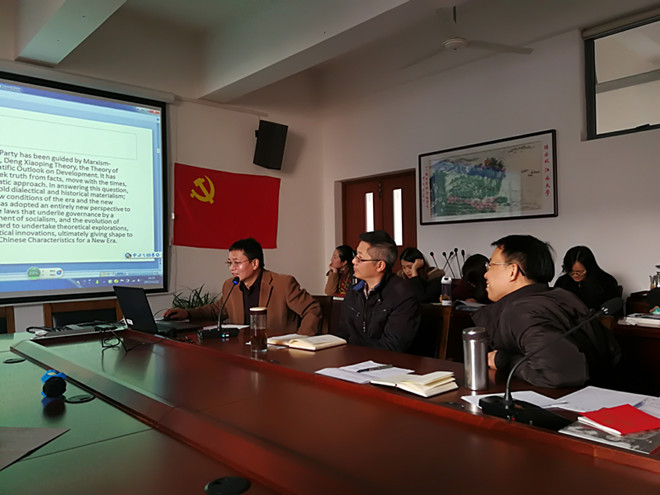 会议在教工党支部书记张俊萍老师的主持下召开,英语系的几位翻译教授、老师详细地交流了十九大报告内容翻译的一些见解和心得体会。龚晓斌老师谈了英汉翻译的措辞问题,孙志祥老师详细讲解了“不忘初心”的译法和提出“不忘初心”的历史背景,王金安老师对“不忘初心”、“社会主义核心价值观”、“坚持人与自然和谐共生”等关键词进行解读,卞正东老师梳理出十九大报告中的57个“心”的翻译,彭方针老师对新时代中国特色社会主义思想“Xi Jinping Thought”的翻译做出自己的理解分析,老师们交流的内容充实,从不同角度和视野为大家解读十九大报告的翻译,并原创性提出自己的心得体会,信息量非常巨大,在场党员同学表示受益良多。彭方针老师以十九大报告中习近平总书记提出的“不要人夸好颜色,只留清气满乾坤”鼓励党员同志们保持党员本色,追求更高的人生境界。