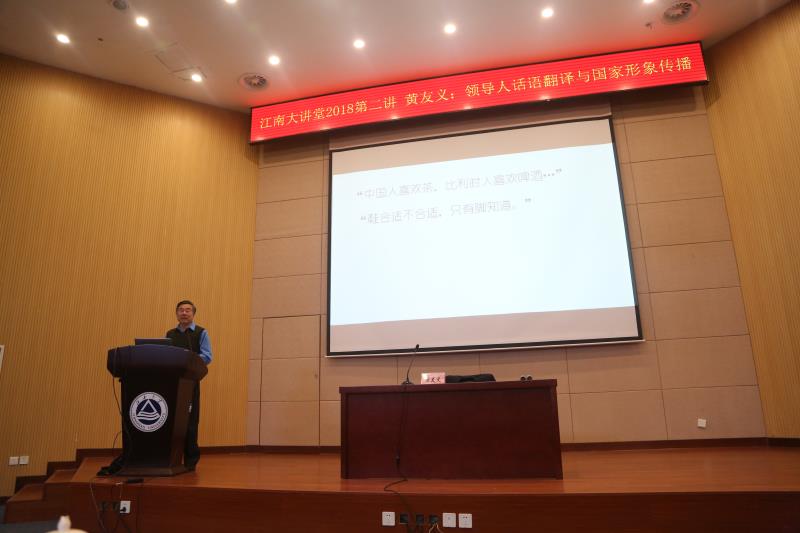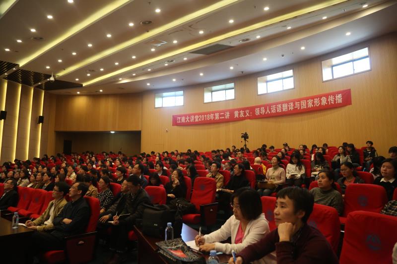 4月9日下午三点,国务院学位委员会委员、全国政协外事委员会委员、中国外文局前副局长、中国译协常务副会长黄友义先生在伟德国际victor1946远东报告厅作了题为“领导人话语翻译与国家形象传播”的学术讲座。此次讲座既是校党委宣传部组织的2018年“江南大讲堂”的第二讲,也是伟德国际1946献礼伟德国际victor194660周年校庆的外语学科系列讲座之一,我校三百多名师生与无锡部分其他学校教师与社会人士参加了此次学术讲座。