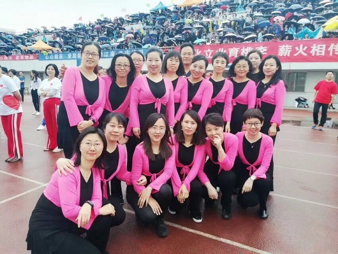 自2017年12月以来,校工会在全校教职工中推广阳光健康、时尚新潮的群众性排舞活动,学院各工会小组推荐了热爱舞蹈积极健身的会员组成了外院舞团。在教练陈洁、高松怡的策划与带动下,舞团成员利用工作之余练习了《来吧,冠军》、《哈达》、《天使的翅膀》等曲目,精心设计了服装、队列等元素,参与了第十八届校运会开幕式的演出。2018年4月25日,全校各单位共二十余支队伍在校体育馆依次进行比赛。我院舞团第十六位出场,在亲友团和学生啦啦队的赞助声中,队员们以饱满的热情展现了排舞的整齐与优美,获得了前八的成绩。