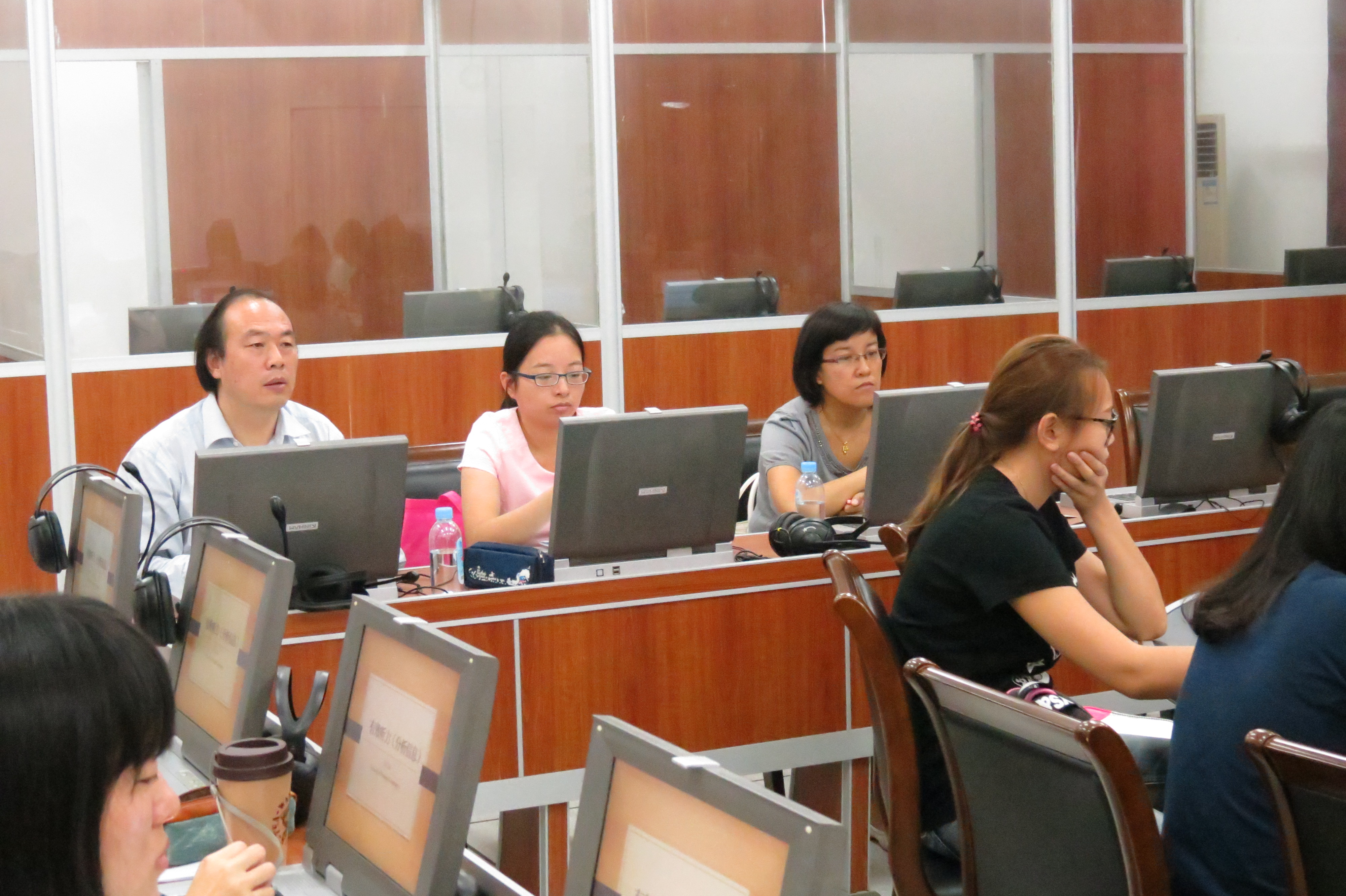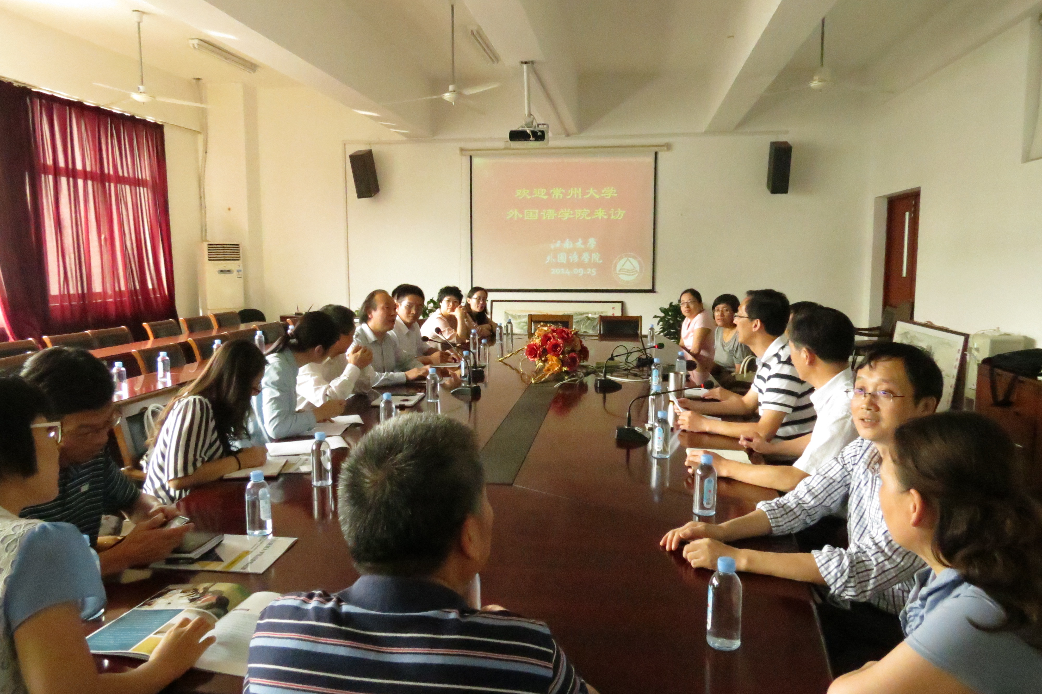 2014925日常州大学伟德国际1946施云兵书记、薛荣院长带领教学、学工、院办、实验中心负责人一行15人来院交流指导,双方就外语课程教学、专业建设、人才引进、师资队伍建设、科研工作及奖励机制、实验室建设、国际交流及学生工作等相关问题进行了相互交流。我院周建中书记、龚晓斌院长参加了交流活动并向来宾介绍了我校大学英语教学改革十年来取得的成绩,及新一轮改革中的课程模块和修读模式。交流期间客人们随堂听取了《大学英语》、《高级口译》、《中级口译》和《商务英语》等课程的课堂教学,参观了我院的数字化外语教学中心。