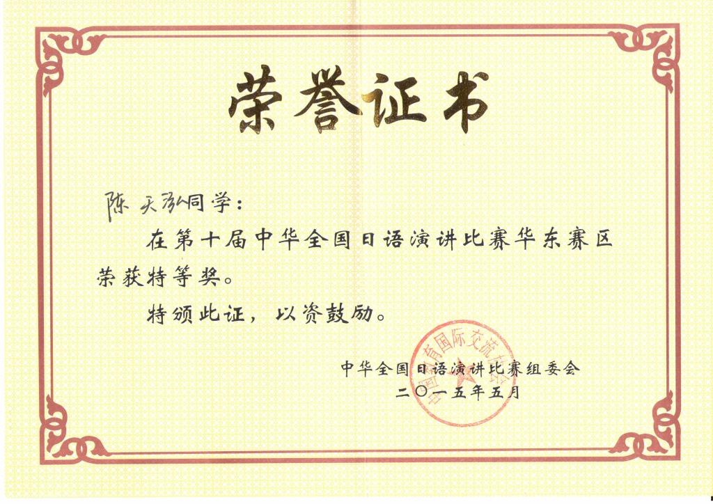 2015年06月13日,第十届中华全国日语演讲比赛华东赛区预赛在复旦大学举行,来自复旦大学、上海交通大学、上海外国语大学、浙江大学、南京师范大学、南昌大学等华东地区21所高校的参赛选手经过激烈角逐,共有8名同学获得不同奖项。我校2013级日语专业陈天泓同学发挥出色,力克华东地区多位名校的优秀代表选手,最终以优异的成绩获得了特等奖,崔明姬老师也获得了优秀指导教师奖,为我校争得了荣誉。这是日语系学子在该项赛事中取得的第二次特等奖。