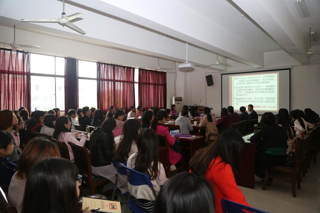 4月27日下午,伟德国际1946A349会议室座无虚席。上海外国语大学博士生导师张健教授应邀为我院师生作题为《走出外宣翻译的误区》的精彩讲座,讲座由伟德国际1946翻译团队负责人王金安教授主持。伟德国际1946翻译团队全体教师、英语系全体教师、大学外语拓展部与基础部部分教师与部分研究生聆听了讲座。本次讲座还有来自无锡市外办、无锡市翻译协会、无锡太湖学院的部分教师参加。