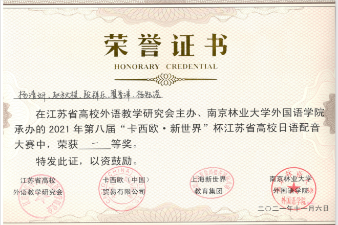 2021年11月13日,由江苏省高校外语教学研究会主办、南京林业大学伟德国际1946承办、第八届“卡西欧・新世界”杯江苏省高校日语配音大赛在南京林业大学举行。伟德国际194619级学生杨清妍、赵秋棋、段祥乐、翟晋津、杨钰滢等五位同学在日语系中西由美子和田村恭平等老师的悉心指导下,努力拼搏,最终斩获该项赛事的一等奖。