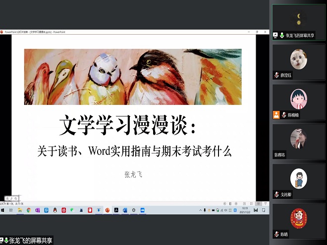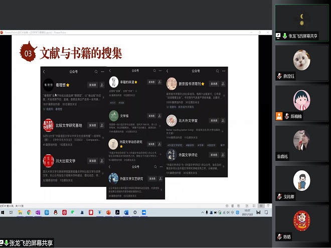 张龙飞同学以“文学学习漫漫谈”为主题,围绕“读书”和“Word实用指南”两个方面分享了自己的经验。在谈读书时,他首先针对选题给出了多与老师沟通与广泛阅读的建议,接着从哲学、文论和小说三方面给出了推荐书目和阅读建议,并以OneNote为例向大家演示了如何做好读书笔记,然后为同学们推荐了与文学研究相关的微信公众号,如“外国文学动态研究”、“外国文学评论”等,还推荐了Z-lib、LoreFree等图书搜索网站。