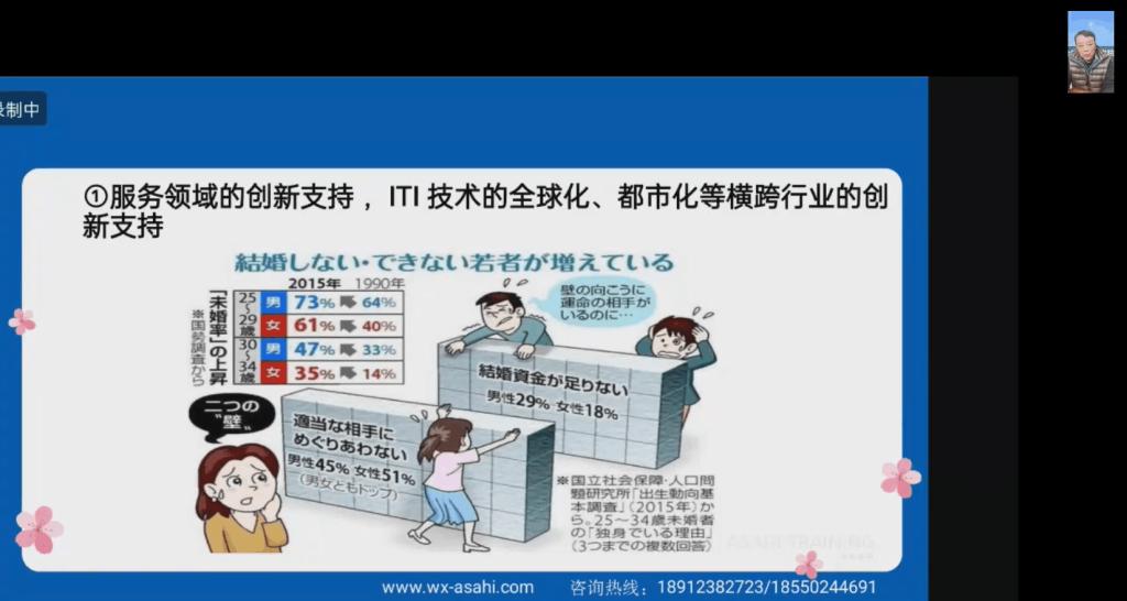 12月16日19时,伟德国际1946日语系师生以线上会议的形式参与了“少子老龄化日本社会的机遇和挑战”学术讲座。本次讲座由日语系主任崔明姬主持,主讲人上海交通大学日本研究中心兼职教授魏海波老师结合自身经历从严峻的后疫情时代现状,日语专业学生迎接挑战的对策,日本一流大学大学院选择原则以及后疫情时代的学习方式变化四个方面进行了生动详细的阐述。魏海波教授曾任上海政治学会理事,上海法学会理事,上海市委宣传部特约研究员,上海市委组织部特约研究员,上海侨商会理事,浦东新区留学生联谊会常务理事。日本三菱综合研究所研究员研究亚洲经济和中国经济,在国内外学术杂志主要专业论著论文50篇。