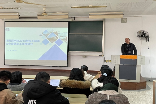 为进一步做好我院2018级学生实习工作,引导学生做好实习前的各项准备,同时推进2022届就业工作的顺利开展,12月28日上午在二教2D108召开2018级实习动员大会暨就业工作推进会,学院党委副书记刘伯贤、副院长顾琦一、英语系副主任杨昊、日语系副主任管纪龙、本科教务王琰玲以及年级辅导员苗文建参加会议。