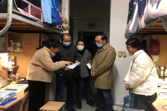 为了给返校的学生带去学院的关心,并及时了解学生的思想动态、学习生活情况,3月22日18:30,伟德国际1946党委书记史志洪、院长方文开、党委副书记刘伯贤、副院长顾琦一、分团委书记陆芳以及辅导员老师一行来到浩苑、润苑公寓,走访关心我院返校学生。