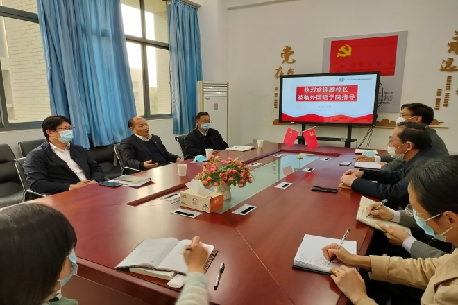 首先,顾正彪关心询问了学院近两年来引进5位教授的情况,并就更好发展进行了针对性指导。随后,结合学校人才工作和科研工作战略部署等情况,指出,今年是全面实施“十四五”规划的关键之年,是学校“奋进计划”启动之年,也是第七轮任期目标的收官之年。他强调,学院要充分认识大学外语教学对学校人才培养的重要作用,加大大学外语综合改革力度,进一步彰显大外教学的贡献度;要探索紧密型团队建设,为教师职称晋升创造条件,营造心无旁骛做教学、专心致志搞科研的更大舞台;要通过引进外语领域有影响力的专家学者、打造品牌性学术会议等措施扩大学科影响力,谋划重大课题等标志性成果,实现跨越式发展。