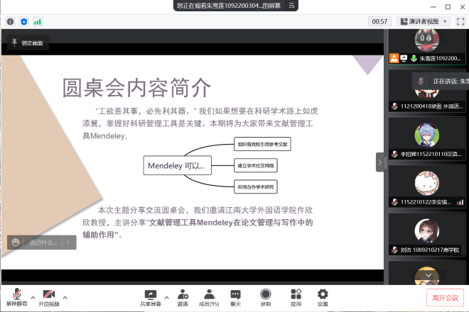 4月6日下午,Sharing space分享交流圆桌会第四期邀请伟德国际1946仵欣欣教授线上主讲“文献管理工具Mendeley在论文管理与写作中的辅助作用”,会议持续近一小时,来自各个学院的120余名同学线上参与,共同了解学习Mendeley。