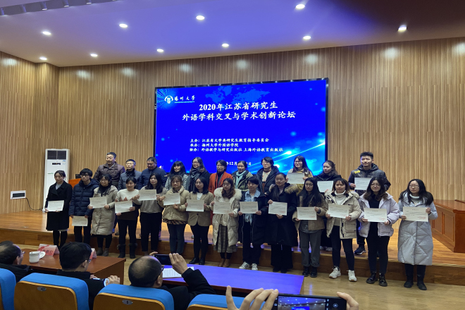 2020年12月19日至20日,江苏省研究生外语学科交叉与学术创新论坛在扬州大学召开。本届论坛由江苏省文学类研究生教育指导委员会主办, 由扬州大学伟德国际1946承办。来自江苏省及长三角地区20余所高校外国语言文学学科90名博、硕士生与10余位带队老师出席了本次学术论坛。我院19级三位研究生向俊蓉,朱春霞,方敏在带队老师孙志祥教授的带领下参加了本次论坛。
