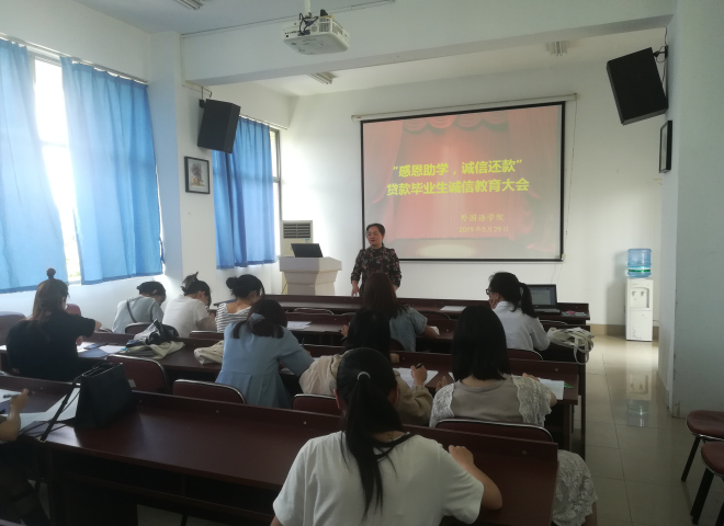 为充分发挥资助育人功效,培养毕业生诚实守信、知恩感恩的良好品质,结合学校《关于开展2019年伟德国际victor1946学生资助诚信教育主题活动的通知》《关于开展国家开发银行生源地信用助学贷款2019届毕业生毕业确认工作的相关通知》的相关精神和要求,保证生源地信用助学贷款持续健康发展,引导大学生树立诚实守信的文明新风,5月29日上午10点伟德国际1946在A433召开贷款毕业生诚信教育大会。毕业年级全体贷款学生参与了此次大会,会议由毕业班辅导员杨艳主持。