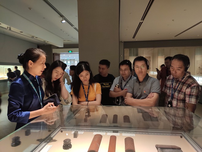 午后,党员教师们怀着对历史的敬仰,在专业讲解员的带领下,前往参观了南京博物院,特别是馆藏丰富的历史馆。随着漆器馆、玉器陈列馆、云锦馆、青铜器馆和清明瓷器馆一一在眼前展开,大家时而驻足、仔细聆听、积极提问。不同时代的馆藏犹如一段段被凝固的历史时光,诉说着中华民族的悠久历史以及在历史长河中所创造的灿烂文明。随后,大家也参观了有馆中之冠称号的珍宝馆和具有浓郁土气息与地方特色的民俗馆,通过这些丰富的馆藏,大家犹如走进了一节生动的爱国主义教育课堂,为中华文明而骄傲、自豪。