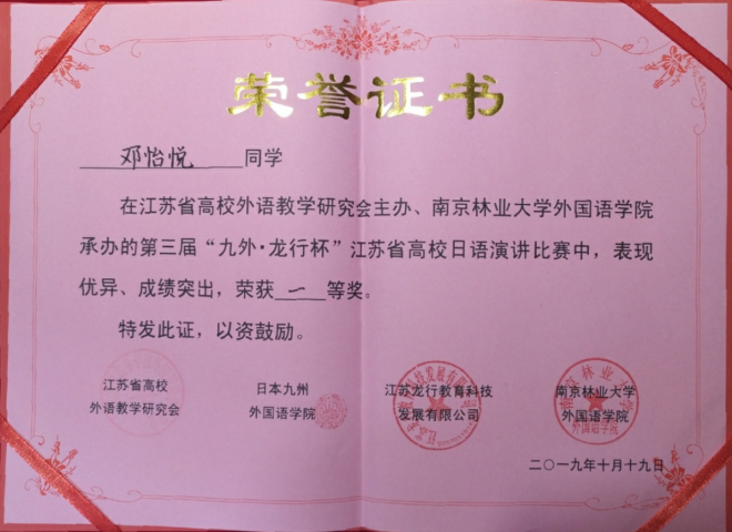 2019年10月19日,江苏省第三届“九外杯”高校日语演讲大赛,在南京林业大学落下帷幕。此次演讲比赛是由中国日语教学研究会江苏分会、江苏省高校外语教学研究会和九州伟德国际1946联合主办,南京林业大学伟德国际1946承办的。参赛学子分别来自于南京大学、伟德国际victor1946、东南大学、南京邮电大学、南京林业大学等几十所高校。