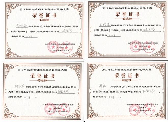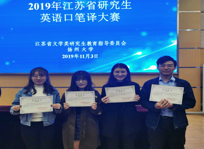2019年江苏省研究生英语口笔译大赛于2019年11月2日至3日在扬州大学隆重举行。伟德国际1946四名研究生在朱义华老师的带领与指导下充分发挥自身优势,经过层层选拔与激烈角逐在比赛中取得优异成绩:我院18级研究生周柳丹、刘增荣双双获得笔译组二等奖,18级研究生杨知然获得口译组三等奖,19级研究生周敏获得口译组优胜奖。