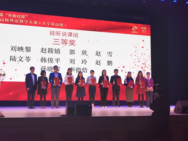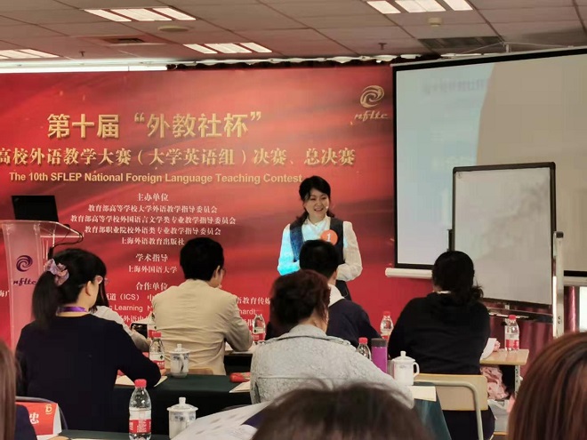 11月1日- 3日,中国高校外语教学界顶级赛事——第十届“外教社杯”全国高校外语教学大赛全国决赛和总决赛在上海外国语大学隆重举行。本次大赛由教育部高等学校外国语言文学类专业教学指导委员会、教育部高等学校大学外语教学指导委员会、教育部职业院校外语类专业教学指导委员会、上海外国语大学和上海外语教育出版社联合组织举办。来自全国30个省、自治区、直辖市的59名分赛区冠军选手,汇聚一堂,比拼教学技能、展示教师风采,角逐中国高校外语教学的最高奖项。我校伟德国际1946刘玲老师作为江苏赛区的冠军选手,参加了本次顶级赛事的角逐。刘玲老师顶住了第一个出场的巨大压力,展示了精妙的课堂设计、良好的师生互动、清晰开阔的教学思路,最终荣获大学英语视听说组全国总决赛三等奖,实现了我校外语教师在国家级讲课比赛中零的突破。