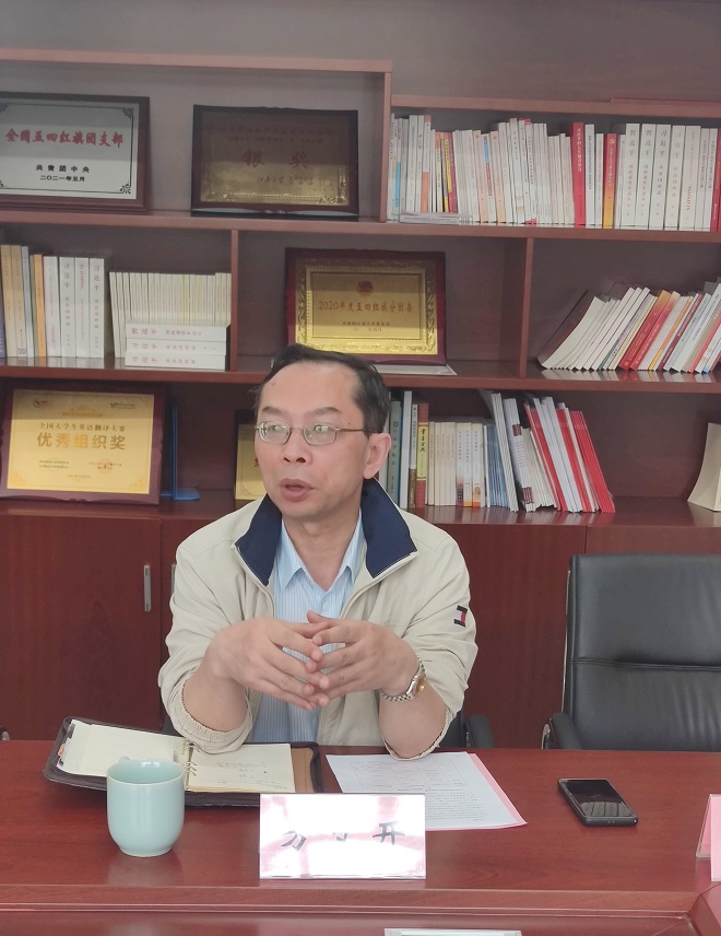 方文开对刘影一行来访表示热烈欢迎,并简要介绍了伟德国际1946的历史沿革、学科建设、MTI申报以及大学英语教学发展与学习效果评价体系一体化平台等情况。