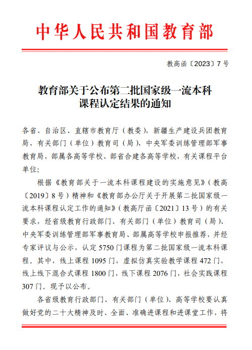 近日,教育部公布了第二批国家级一流本科课程名单。根据教高函〔2023〕7号《教育部关于公布第二批国家级一流本科课程认定结果的通知》,我院《高级英语(1)》在线课程获评第二批国家级一流本科线上课程认定。