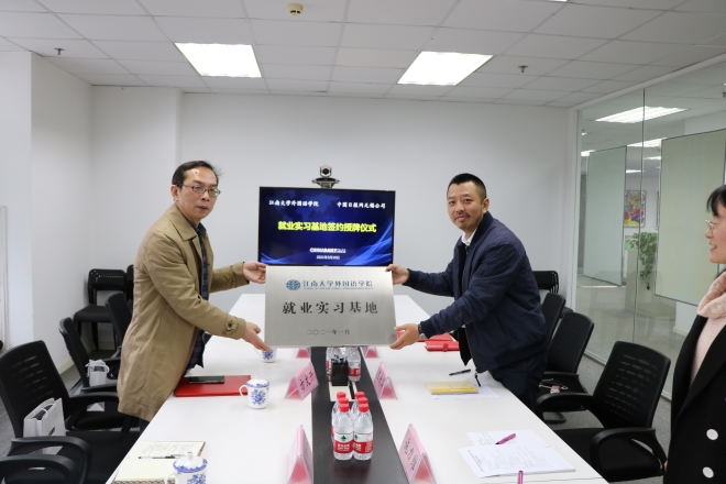 会议最后,双方就就业实习基地的建立意义和人才培养战略进行了深入的探讨并达成一致,双方代表在实习基地协议书上签字,院长方文开代表学院向中国日报网无锡公司代表授予“就业实习基地”铜牌。