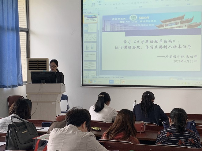宣泠老师带领全体教师系统学习了《大学英语教学指南》(2020版),先回顾了历年来大学英语教学指导文件的演进,进而围绕《指南》的九个部分,明确了课程定位与性质,教学目标与要求、课程设置结构与内容、评价与测试、教学方法与手段、教学资源、教学管理以及教师发展的内容,为后续推进大学英语教学改革提升了理论水平。
