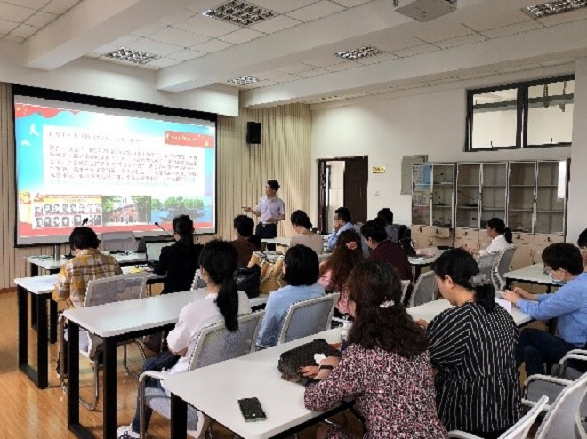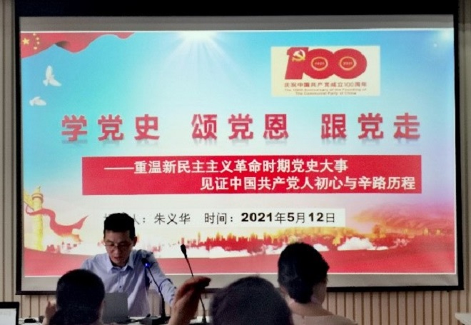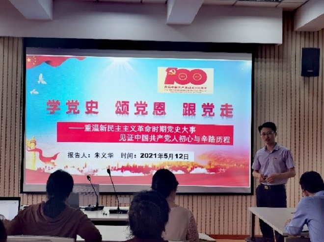 首先,副院长朱义华以“学党史、颂党恩、跟党走——重温新民主主义革命时期党史大事,见证中国共产党人初心与辛路历程”为主题,给全体党员老师上了一堂图文并茂、精彩深刻的党课。