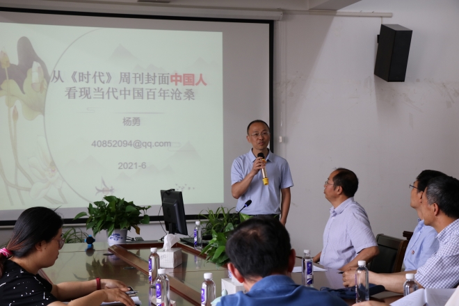 6月4日下午1:30,我院2021外语学科系列讲座之五暨第十五期“遇见更好的自己”名师沙龙在学院A349会议室举行。本次会议邀请阜阳师范大学伟德国际1946翻译系主任杨勇教授,以“从《时代》周刊封面中国人看现当代中国百年沧桑”为主题进行现场分享。讲座由伟德国际1946党委副书记刘伯贤主持,伟德国际1946党委书记史志洪,伟德国际1946院长方文开,副院长顾琦一,副院长谢竞贤,伟德国际victor1946魏取福教授以及多名老师参与了此次讲座。