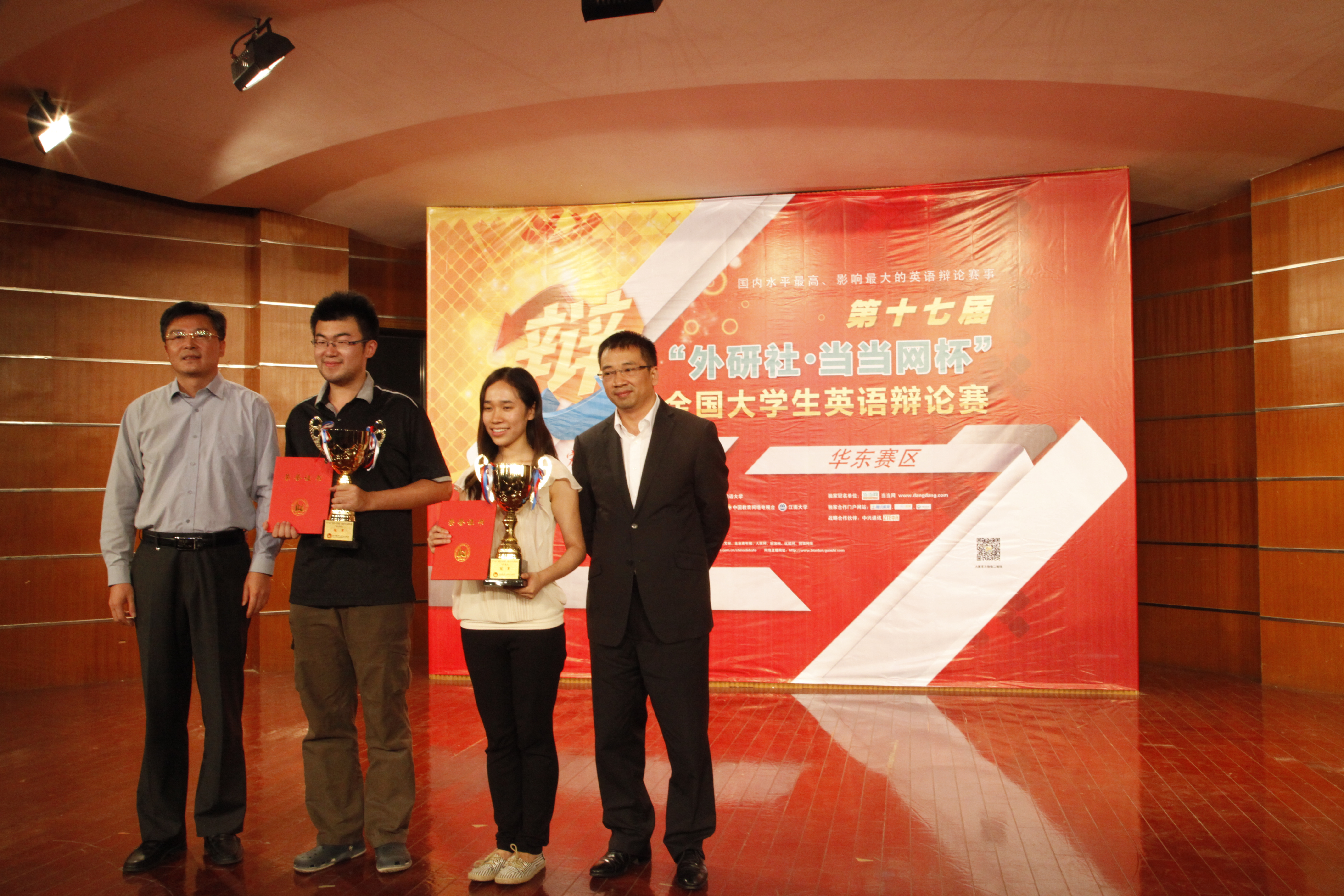 10月13日下午15:30,由共青团中央学校部、全国学联秘书处、北京外国语大学主办,外语教学与研究出版社、中国教育电视台和伟德国际1946承办的第十七届“外研社·当当网杯”全国大学生英语辩论赛(华东赛区)在我校大学生活动中心圆满落下帷幕。伟德国际victor1946党委副书记符惠明、外研社副社长谢文辉、共青团中央江苏团省委学校部副部长高健等领导出席了决赛暨颁奖仪式,新华社、现代快报、扬子晚报、江苏电视台、人民网等多家知名媒体进行了报道。