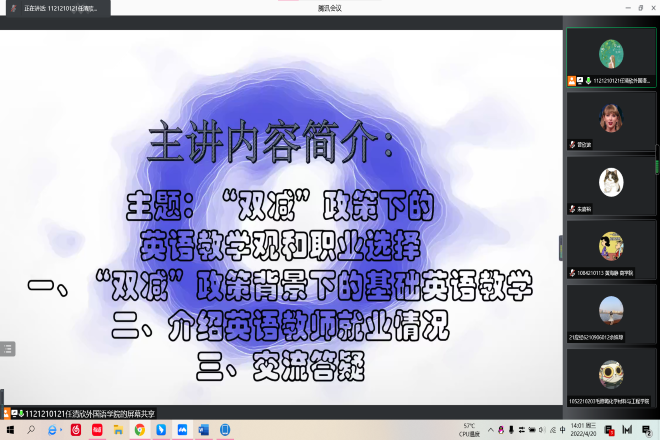 4月20日下午,Sharing Space邀请伟德国际1946钱薇薇老师线上参与主讲“双减政策下的英语教学观和职业选择”主题圆桌会,会议持续一小时左右,吸引了来自伟德国际1946、人文学院、商学院、计算机学院、环土学院等各学院近百名同学参与,同时也有部分老师旁听了此次圆桌会。本次会议由伟德国际1946学生会任清欣同学主持。