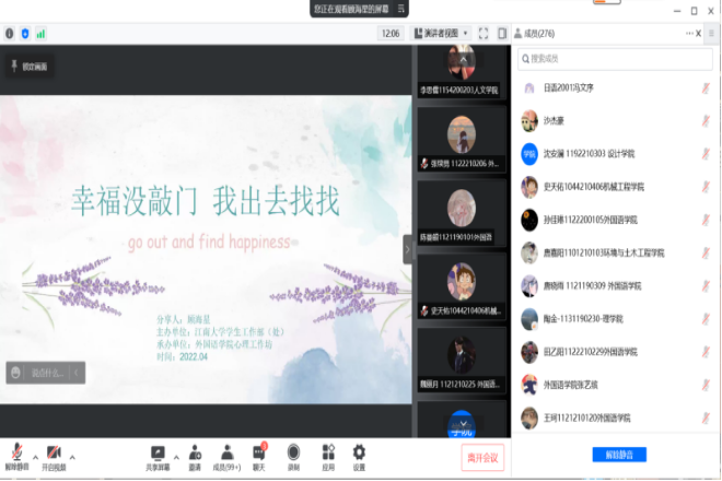 4月27日下午,Sharing Space邀请伟德国际1946辅导员顾海星老师线上进行“幸福没敲门,我出去找找”主题交流。本次交流会是伟德国际19462022年心理文化节期间立项的校级示范项目---“‘COLOR’五个一 多彩未来 向阳同行”活动之一。会议吸引了来自伟德国际1946、食品学院、生物工程学院等360余名同学参与。