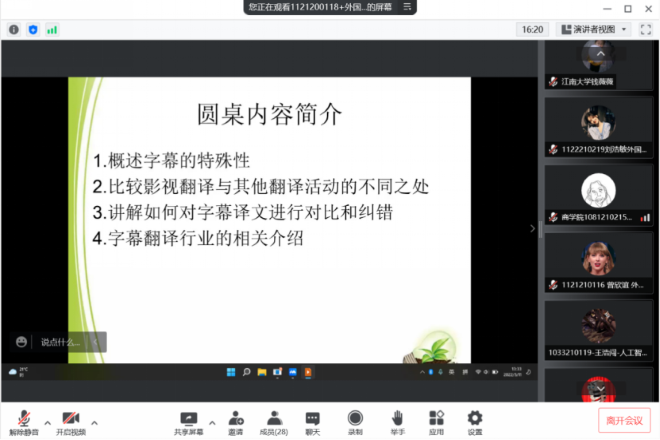 5月11日13时,伟德国际1946主题系列活动第十期“Sharing Space”邀请伟德国际1946金波老师线上进行“影视字幕介与谈”主题圆桌会,会议持续90余分钟,吸引来自伟德国际1946、设计学院、人文学院、商学院等同学参与,会议由伟德国际1946学生会黄俊秀同学主持。