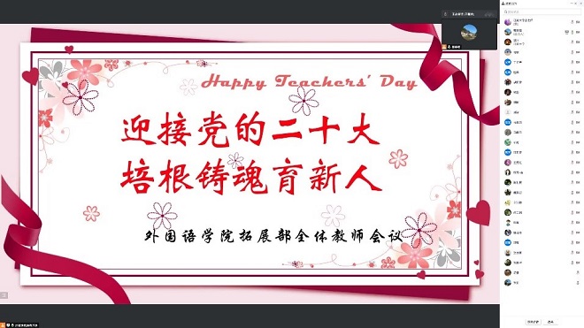 在第38个教师节来临之际,伟德国际1946大学英语拓展部全体教师于9月8日下午2点,相聚云端,以 “迎接党的二十大,培根铸魂育新人”为主题,进行了立德树人研讨活动。伟德国际1946副院长谢竞贤老师出席了本次研讨,支部书记邢嘉锋老师主持了本次研讨会。