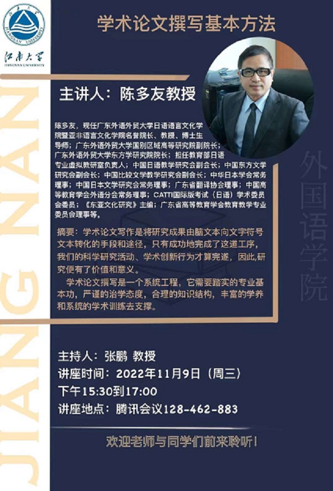 11月9日下午,教育部外国语言文学教学指导委员会日语分委员会委员、广东外语外贸大学东方研究院院长陈多友教授应邀为我院师生做了题为“学术论文撰写基本方法”的线上专题讲座。讲座由日语系主任张鹏教授主持。